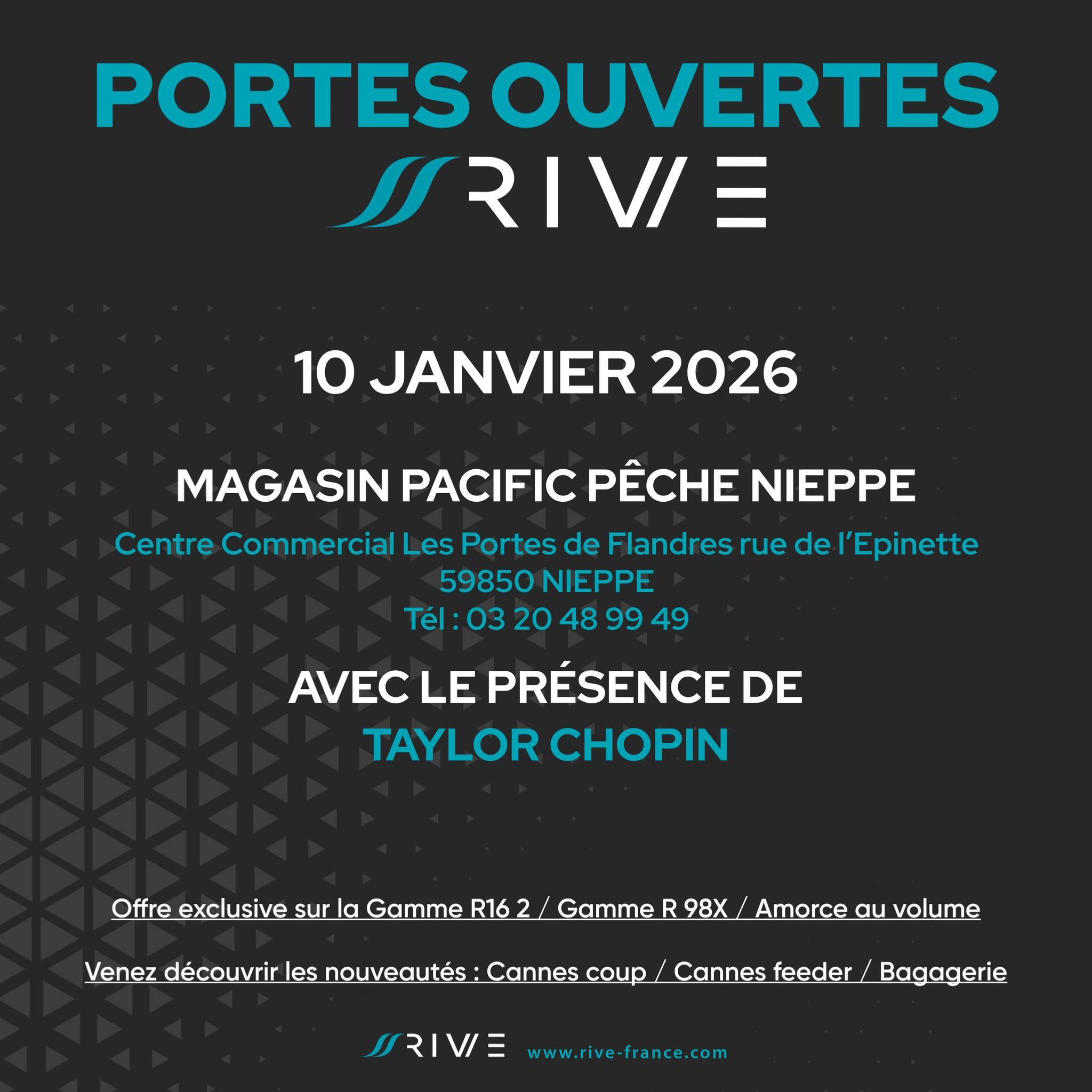 Ce samedi 10 janvier, notre commercial Taylor Chopin, accompagné de notre ambassadeur Franck Leplat, Champion de France Method 2025, seront présents au Pacific Pêche de Nieppe pour vous faire découvrir les nouveautés 2026, la gamme 2025, et vous faire profiter d’offres spéciales exclusives Portes Ouvertes ! > Domaine de Chassemy - 11 janvier 2026 ! Rappel également de la Porte Ouverte au Domaine de Chassemy, avec notre commercial France Laurent Emonet et nos ambassadeurs Franck Leplat et Nicolas Rieffel ce dimanche 11 janvier 2026 ! Une belle occasion pour : - poser toutes vos questions - profiter de conseils personnalisés - découvrir ou redécouvrir nos produits - repartir avec le meilleur du matériel Rive pour préparer votre prochaine saison de pêche ![]() ![]() ![]() ![]() ![]() ![]() ![]() PORTES OUVERTES - 2026 !Nos commerciaux et ambassadeurs seront présents pour vous faire découvrir les nouveautés 2026, la gamme 2025 et vous faire profiter d’offres spéciales exclusives Portes Ouvertes !