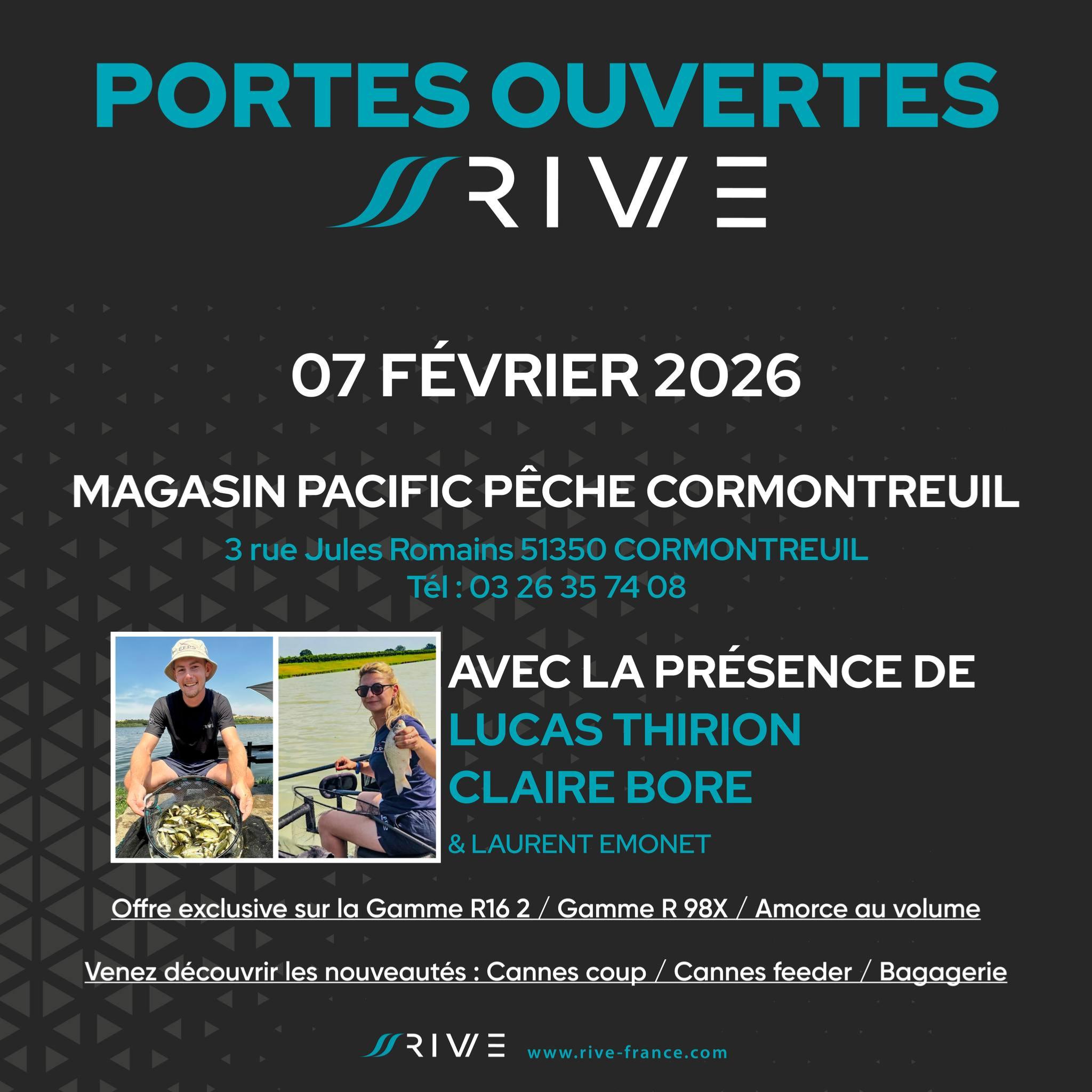 6 décembre – Lampertheim avec Laurent Emonet 6 décembre – Béthune avec Taylor Chopin Premières dates 2026 : 10 janvier – Nieppe avec Taylor Chopin 7 février – Cambrai avec Taylor Chopin 7 février – Cormontreuil avec Laurent Emonet Une belle occasion pour : poser toutes vos questions profiter de conseils personnalisés découvrir ou redécouvrir nos produits repartir avec le meilleur du matériel Rive pour préparer votre prochaine saison de pêche ! ![]() ![]() ![]() ![]() ![]() PORTES OUVERTES Pacific Pêche ! :Nos commerciaux et ambassadeurs seront présents pour vous faire découvrir les nouveautés 2026, la gamme 2025 et vous faire profiter d’offres spéciales exclusives Portes Ouvertes !